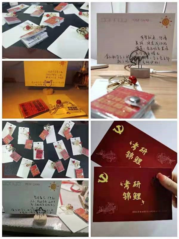 为增强支部考研党员的信心,同时充分调动学生党员为同学服务的积极性,12月12日至13日beat365在线唯一官网本科第二学生党支部开展“研途送温暖”活动。活动开始前,支委为考研党员同志购买明信片和纪念钥匙扣。12月12日中午,支部其他党员一起为考研的党员同志书写句句祝福话语,默默派送到每个考研党员同志的宿舍书桌,精心地准备温暖的小惊喜。本次为考研党员同志送温暖活动,不仅以正能量的方式激励了考研学子,鼓舞奋战考研的学子们以积极的心态投入备考冲刺阶段,也彰显了党支部的人文关怀,有助于营造支部团结温馨的氛围。辛苦学习了一天回到宿舍的党员同志们在看到书桌上的纪念品和卡片,纷纷表示感动和感谢!