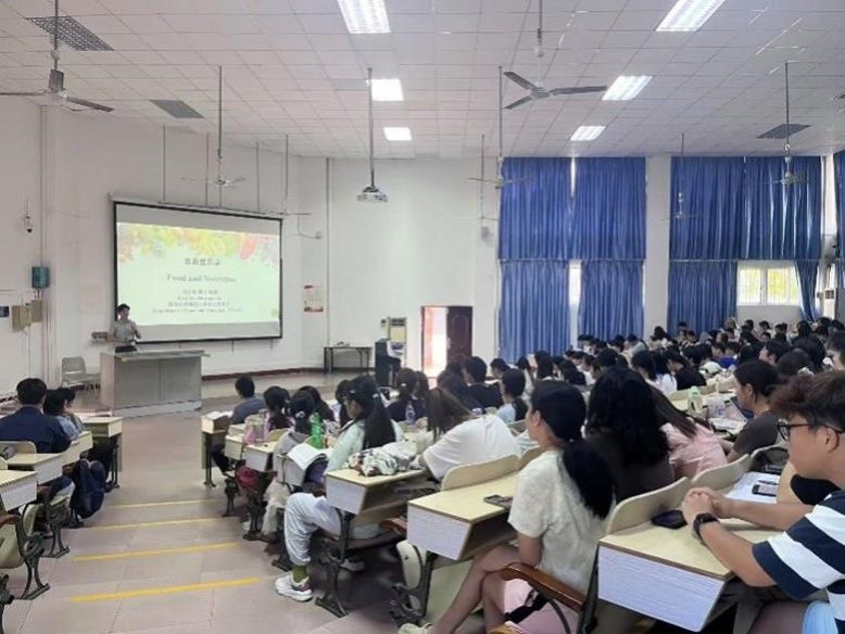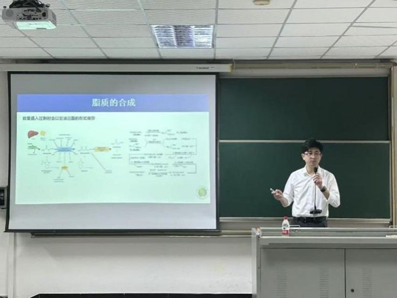 在授课过程中,刘老师以“脂质的消化吸收”为切入点,深入浅出地介绍了脂质的类型、脂质的代谢与心脑血管疾病三者之间的关系,并且讲解了体脂过高的干预策略。刘老师知识渊博,条理清晰,语言风趣幽默。他结合生活中的热点话题和典型事例,与同学们探讨了脂质的生理功能,给大家留下了深刻印象。同学们都聚精会神,专心致志地听课,积极与刘老师互动交流,收获了丰富的知识,拓宽了学习的视野。