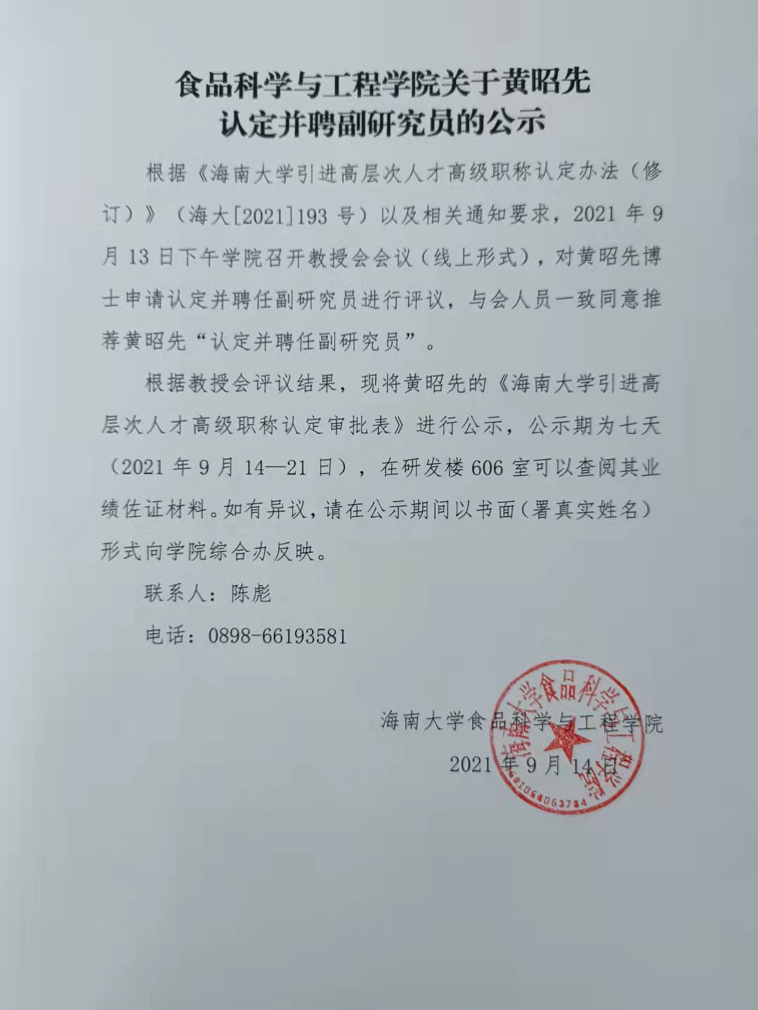 beat365在线唯一官网关于黄昭先认定并聘副研究员的公示